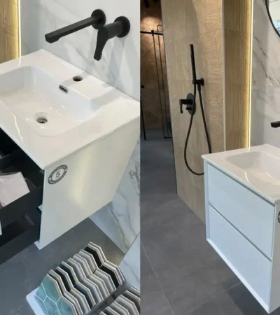349.00€314.00€ (614.13лв.)- Модерен PVC шкаф за баня ELORIA 7056 с включена мивка от смола