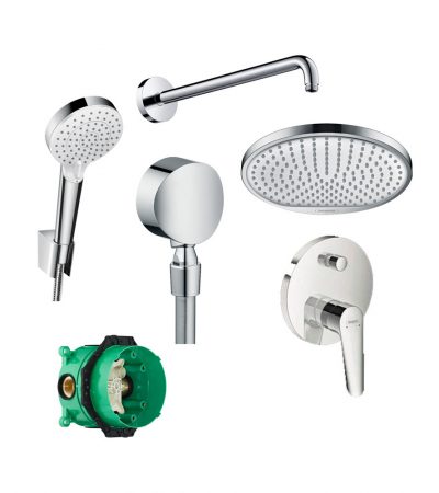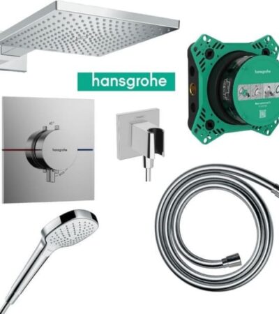 Комплектът включва: 26066GL0 Душ глава с рамо, 29119GL0 термостатен смесител, 35600000 тяло за вграждане