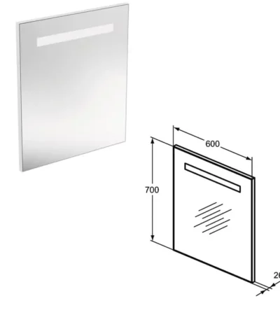Mirror & Light огледало с осветление Mid 60×70 cm, форма: правоъгълна, странична рамка: с размера на огледалото, възможност за реверсивна инсталация, LED Осветление: горно, система против конденз, без ел. ключ, 220-240 V, 50-60 Hz, IP44, Class II
