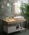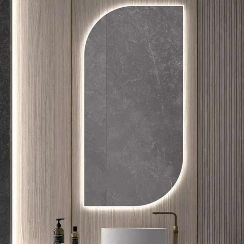 Модерно огледало за баня с вградено LED осветление и неправилна форма