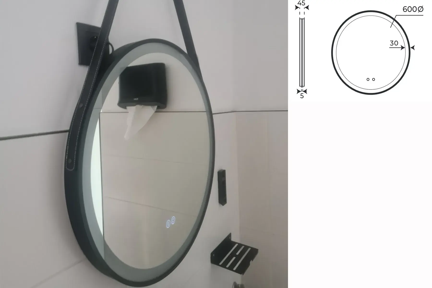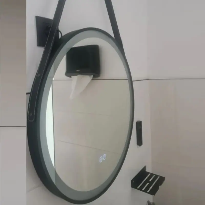 Кръгло LED огледало за баня Adriano Ø60 см с черна кожена рамка и кожен колан, подсветка, димиране и функция против запотяване. Подходящо за бани и модерни интериорни пространства.