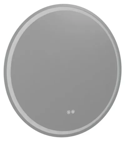 Кръгло огледало с диаметър 60 см, 5 мм стъкло и алуминиева рамка в матово бял цвят. Задно LED осветление (6500K), функция против замъгляване и двоен кръгъл тъч бутон за управление.