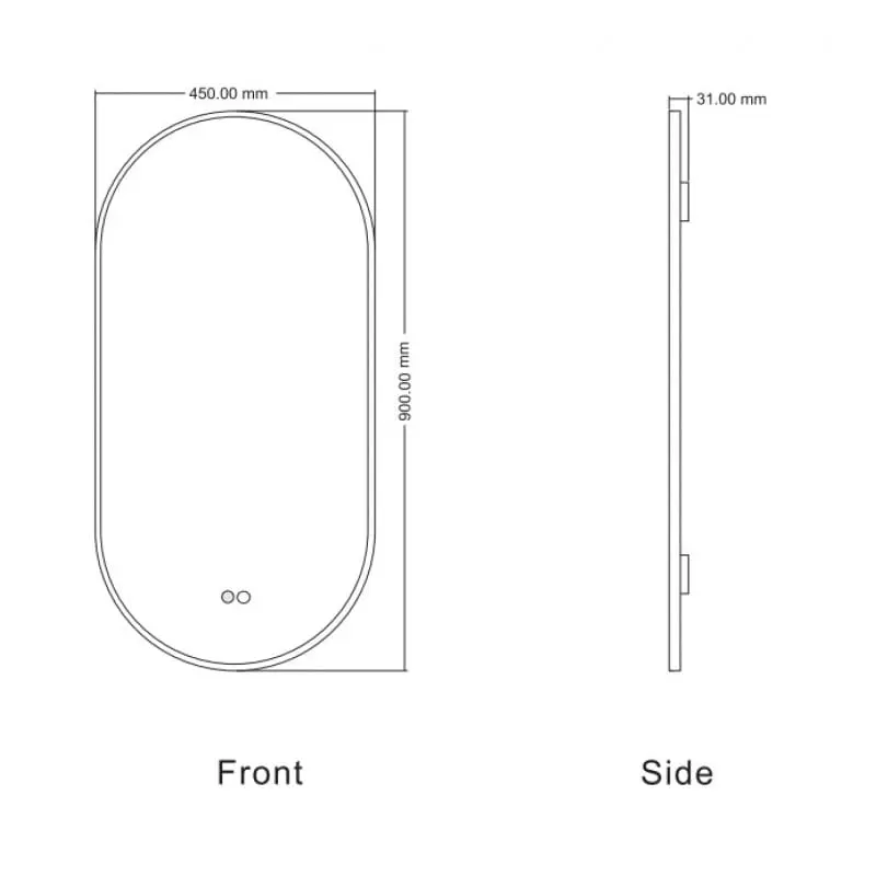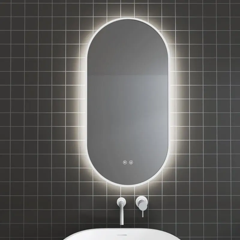 Овално огледало с размери 45×90 см, 5 мм стъкло и алуминиева рамка в матово бял цвят. Задно LED осветление (6500K), функция против замъгляване, двоен тъч бутон. Подходящо за хоризонтален или вертикален монтаж. С включени 4 точки за окачване и голям нагревател против замъгляване.