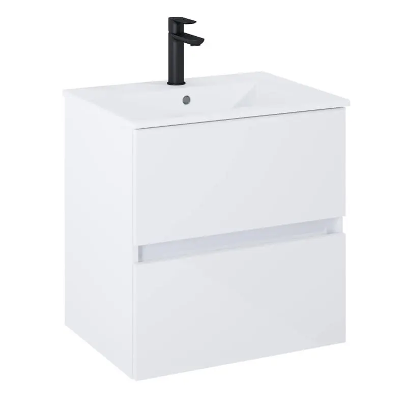 Шкаф Unik N-Cube 550 x 430 x 565 mm е стилно решение за модерната баня, съчетаващо функционалност и изчистен дизайн. Моделът включва базов модул с 2 чекмеджета и умивалник от порцелан в елегантен бял гланц, позициониран централно с 1 отвор за смесителна батерия. Подходящ за стенен монтаж и изработен от качествени материали – MDF корпус и порцеланов умивалник.